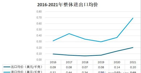 我國(guó)石英及石英巖全體進(jìn)口均價(jià)繼續(xù)領(lǐng)先,2021年進(jìn)口均價(jià)為0.69美元/千克,出口均價(jià)僅為0.2美元/千克。