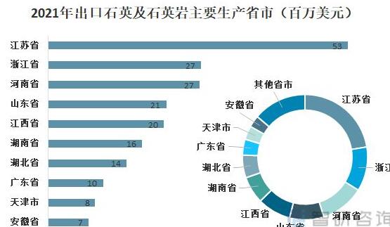 我國(guó)出口石英及石英巖首要來(lái)自江蘇省,2021年出口金額為53百萬(wàn)美元,其次為浙江省和河南省,出口金額約為27百萬(wàn)美元。